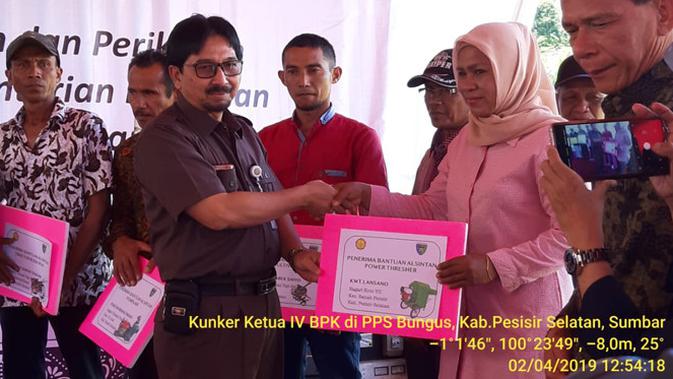 Liputan6.com, Pesisir Selatan Kementerian Pertanian (Kementan) melalui Direktorat Jenderal Prasarana dan Sarana Pertanian (PSP), menyerahkan bantuan alat mesin pertanian (alsintan) senilai Rp 590 juta ke sejumlah petani di Kabupaten Pesisir Selatan, Sumatera Barat. Bantuan diserahkan saat kunjungan kerja anggota IV BPK RI ke Kecamatan Bungus Teluk Kabung, Kota Padang, Selasa (2/4/2019). Acara tersebut dihadiri langsung oleh Bupati Pesisir Selatan, Hendrajoni, dan beberapa pejabat pusat, provinsi, serta petani penerima bantuan.