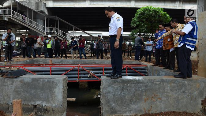 Gubernur DKI Jakarta Anies Baswedan berdialog dengan petugas saat meninjau titik banjir di sekitar flyover Pancoran, Jakarta, Kamis (4/4). Gubernur DKI Jakarta memberi peringatan keras kepada kontraktor LRT untuk membenahi saluran air yang terkena proyek. (merdeka.com/Imam Buhori)