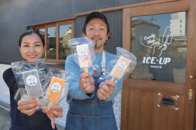 兵庫県淡路市志筑の住宅街で、淡路島内産の果物などを使ったアイスキャンディー専門店「ICE-UP(アイスアップ)」が人気を集めている。切り盛りするのは、地元出身の多田健造さん(37)と妻のゆうこさん(31)。今年オープンしたばかりで淡路市のふるさと納税返礼品にも登録され、2人は「アイスを通して島の良さを発信できれば」と力を込める。(吉田みなみ)