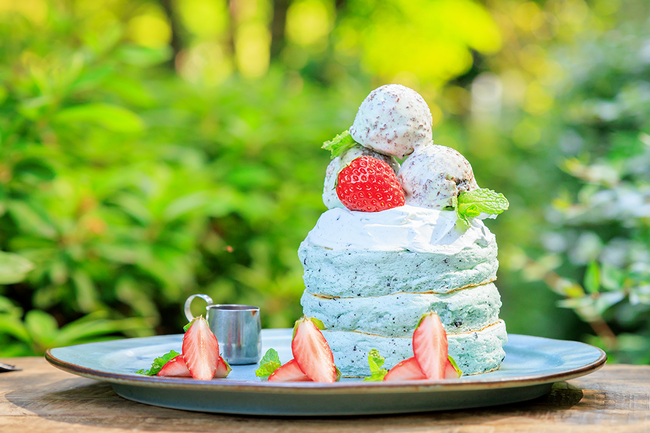 東京六本木店は、自家製アールグレイチョコレートと苺をアクセントに入れた「チョコミントパンケーキEAST」。