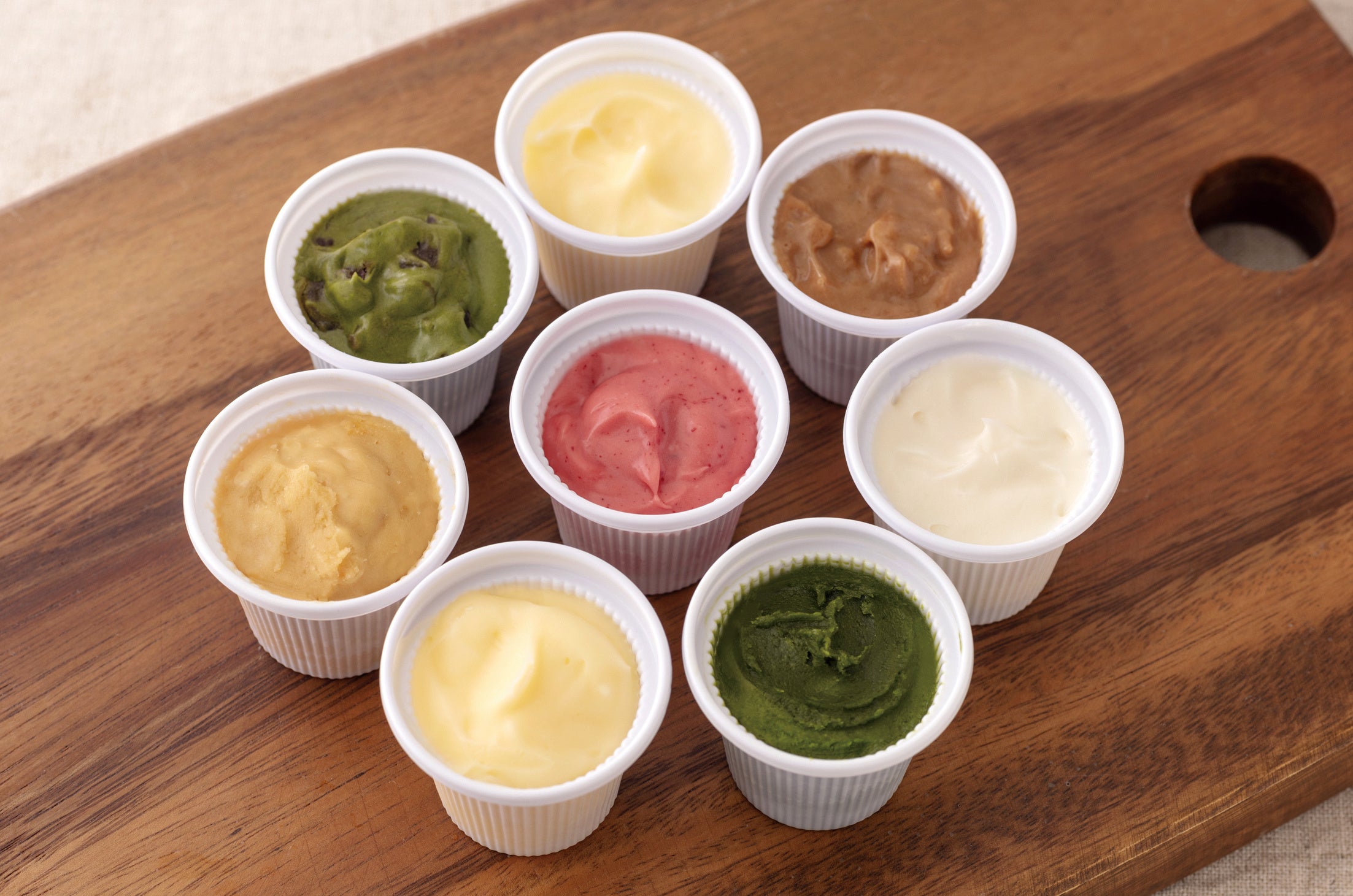 「米バター」の味のベースは、ピエール・エルメ・パリのシェフパティシエ経験もある野口政寿シェフが監修。米からつくられたトランス脂肪酸不使用のバターで、SDGsの観点から動物性に代わるものとして今注目されています。練乳、抹茶、キャラメル、ナッツ、いちご、トリフ、豆乳※をご用意。※豆乳のみ豆乳バターを使用。※シェフの経歴は後述。