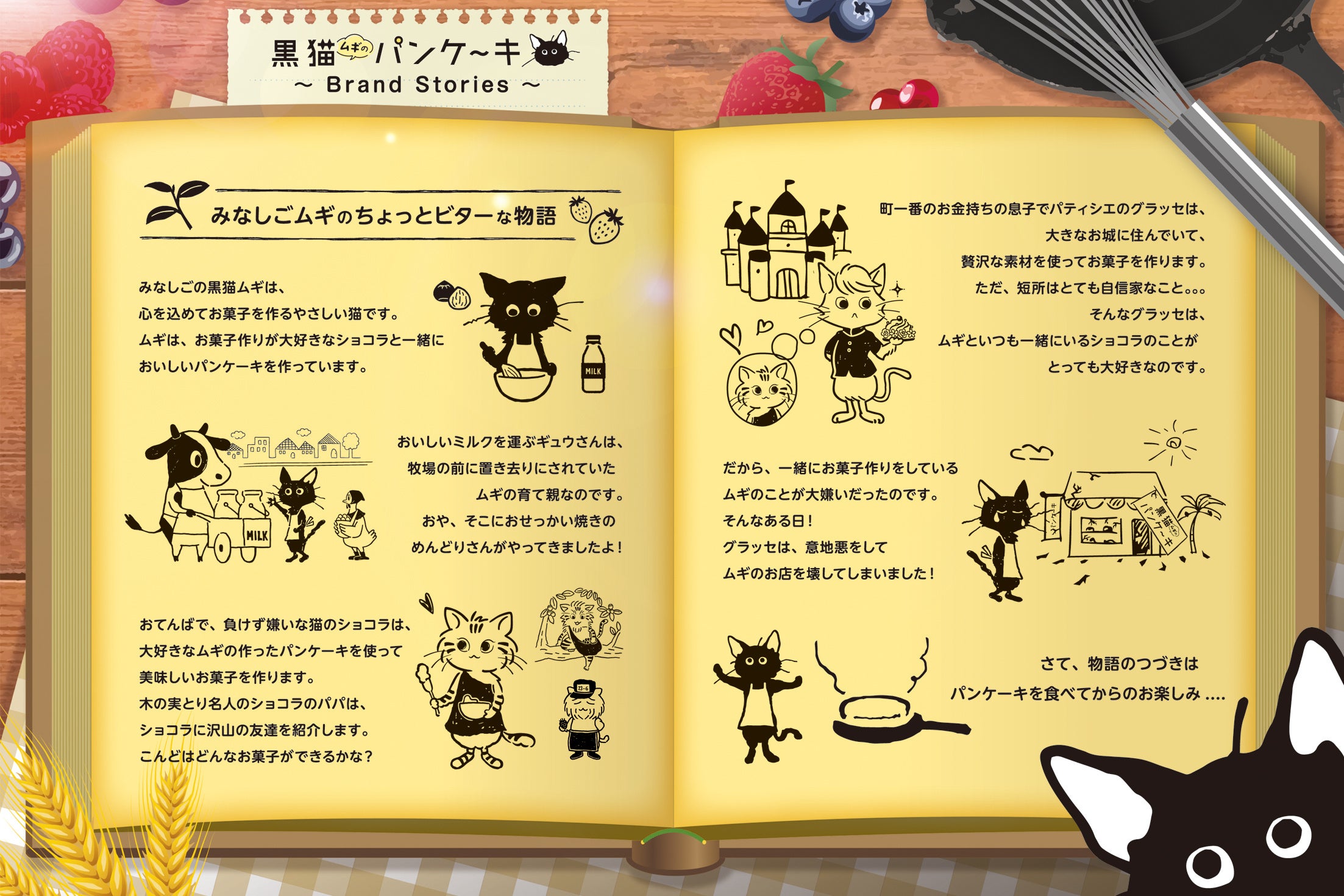 ショップのコンセプトであるオリジナルストーリーの中で、みなしごだったムギが、育ての親や村の仲間たちに囲まれ成長していきます。パンケーキショップを開いたムギが出会うのは自立した女の子ショコラや、ライバルのいじわる猫のグラッセ。様々な登場人物たちの家族のかたちを、楽しくもビターな物語を通して多くの方に感じてもらいたいと思っています。