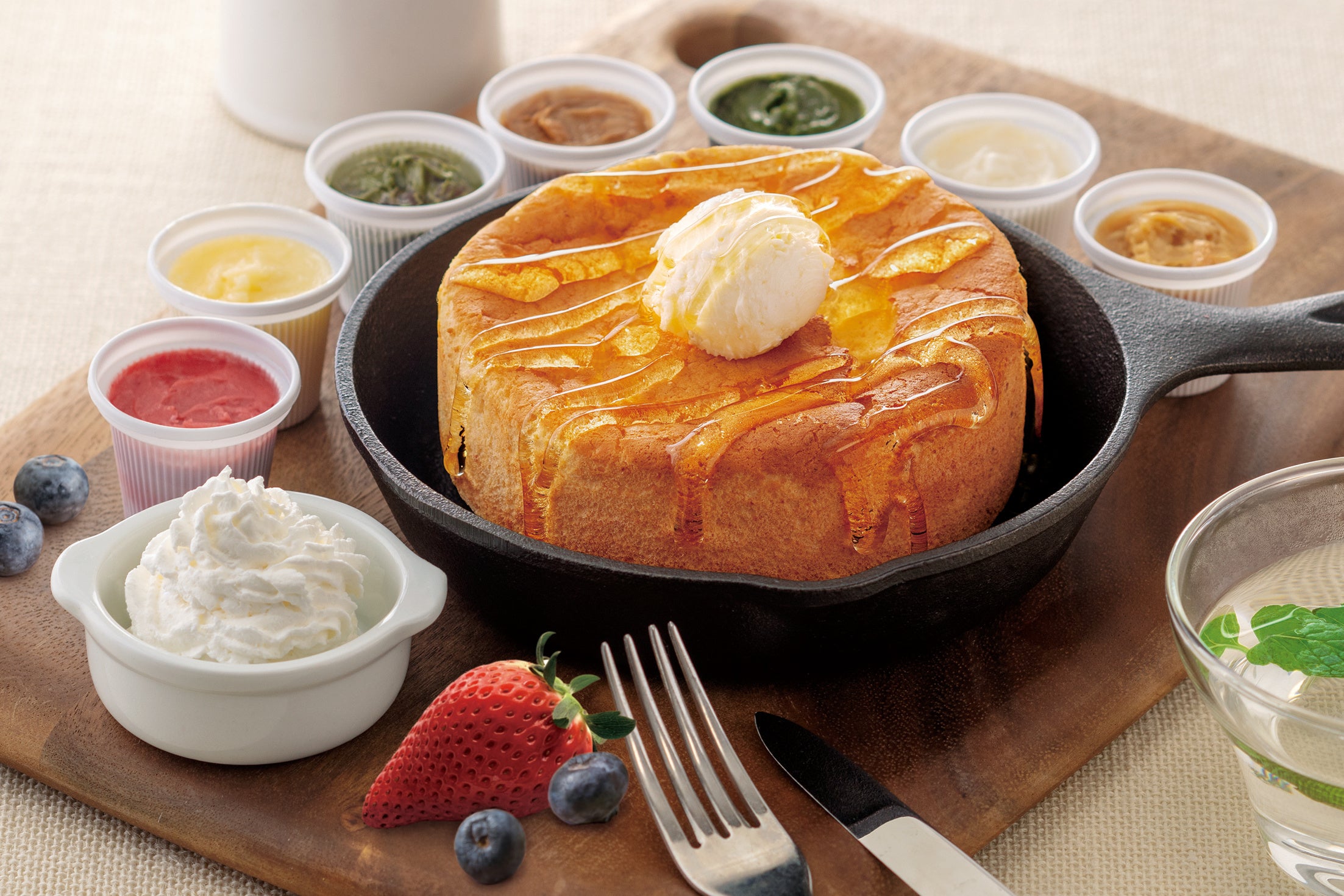 厳選したサワークリームとリコッタチーズを、国産の小麦と卵、生乳でつくった生地に混ぜ、メレンゲで仕上げ、ふわふわしっとりとした食感を追求しました。フライパン型のかわいい特製スキレットに入れてお渡しします。食べた後は、おもちゃのフライパンとしても使用できます!